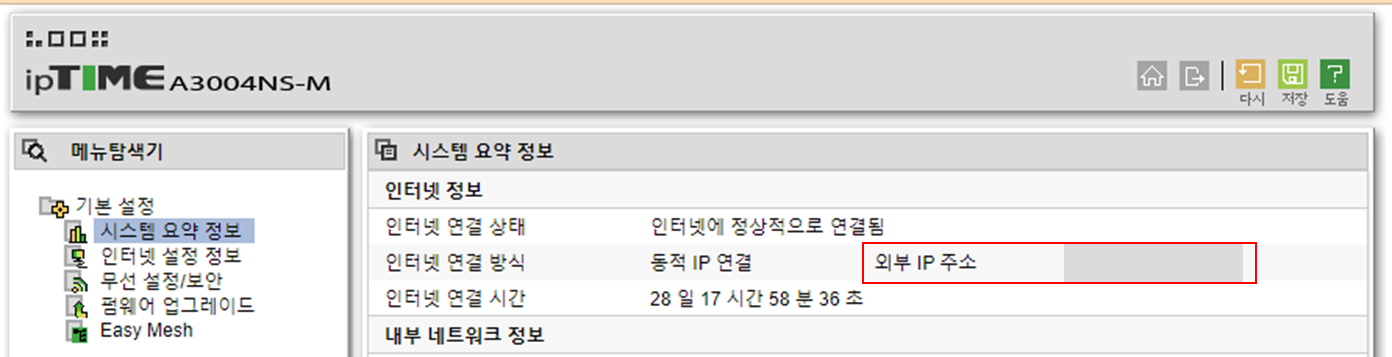 공유기 관리자 페이지의 "시스템 요약 정보" 메뉴에 접속하면 아래 그림처럼 외부 IP주소를 확인할 수 있다.
