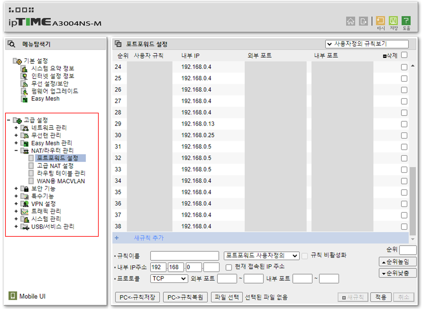왼쪽 메뉴에서 "고급 설정 > NAT/라우터 관리 > 포트포워드 설정" 메뉴로 이동하면 아래와 같이 나온다.